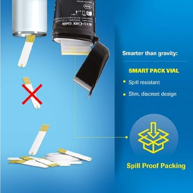 Spill proof packing:Spill resistant vial designed to hold strips tightly in place. |
