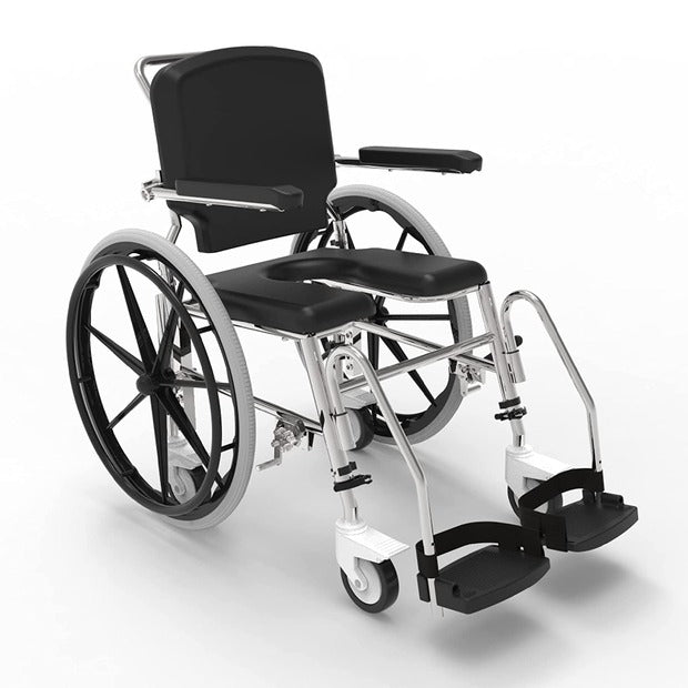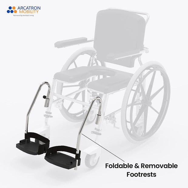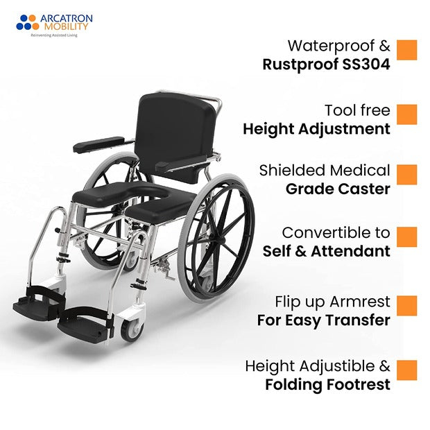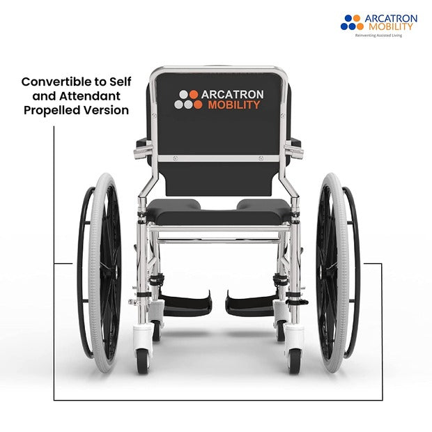 The Arcatron SSS100 is a Self-propelled wheelchair designed for senior citizens and individuals with limited mobility to access shower or commode in a secure and convenient manner. Our unique tool-free height adjustability eases transfers to bed and allows to roll in over different commode heights. Easy to disinfect, waterproof cushions enable to maintain hygiene standards. The user-friendly tool-free assembly allows the chair to fit in your car for travel. SSS100 frame is corrosion resistant and designed for a comfortable and safe experience.