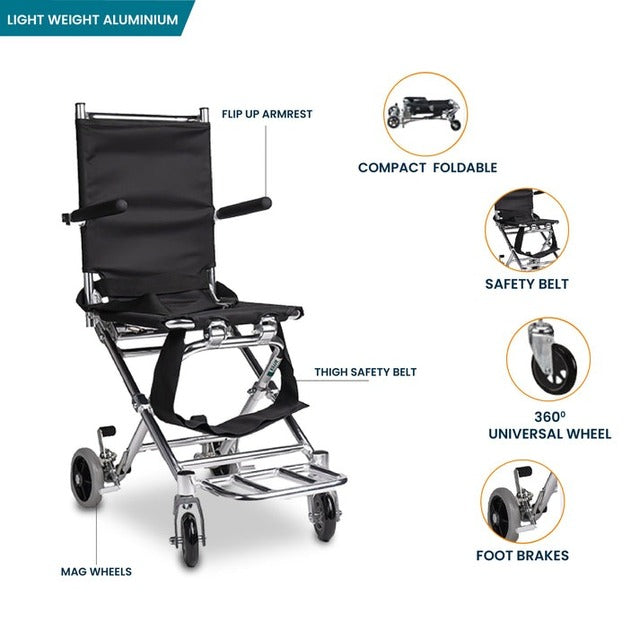 Acing all safety guidelines, the Arrex Airlift wheelchair comes with two safety belts, one at the back and the other on the thighs. This chair is lightweight and comes with an attendant foot break, making it easier for you to stroll around in comfort with your loved one. The special feature in Airlift is compact-folding and hence, it is easily portable. The flip-up handles make it easier for you to access the chair as you want to, while the mag wheels help create balance and friction at the same time. Arrex wheelchairs are designed in Canada.