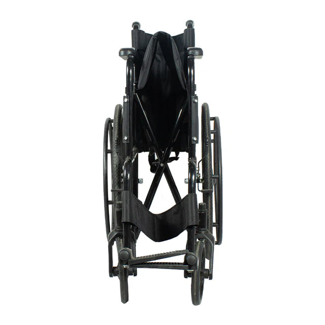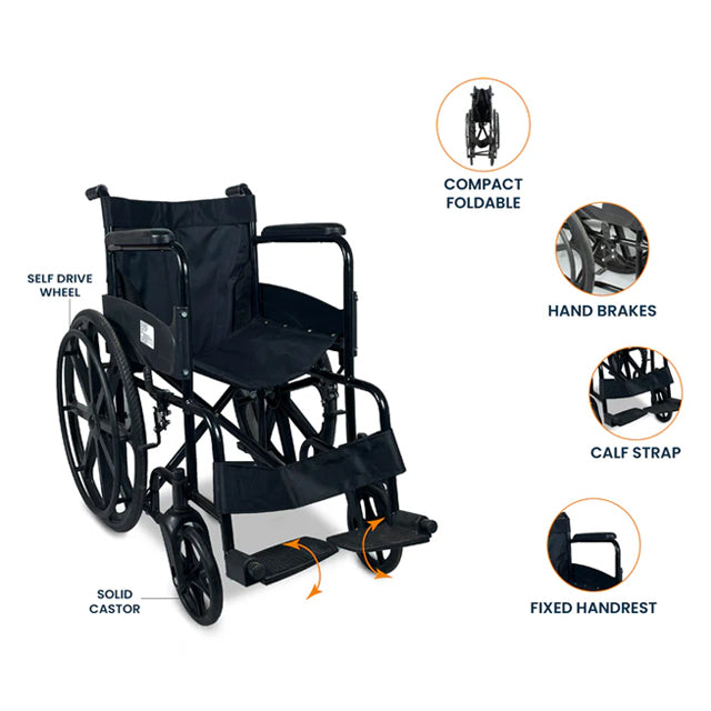 - The wheelchair is designed with self-drive wheels, allowing users to independently propel themselves.