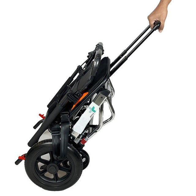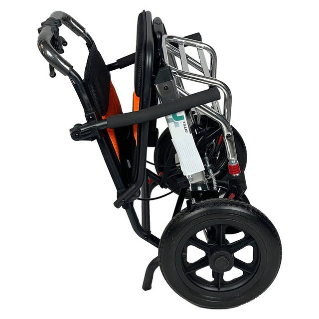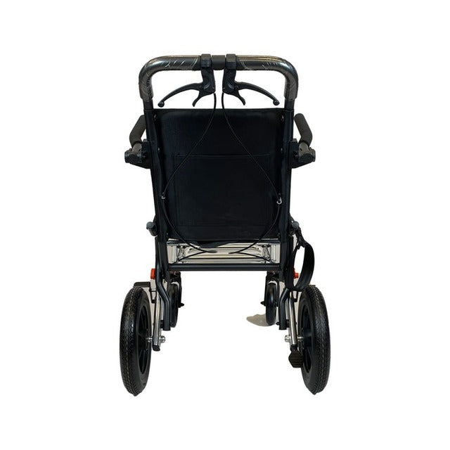 - Integrated pulling handle allows the wheelchair to be pulled like a trolley when folded.