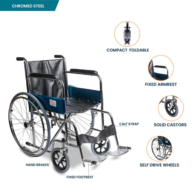 - The wheelchair features solid castor wheels, ensuring durability, stability, and a smooth ride.