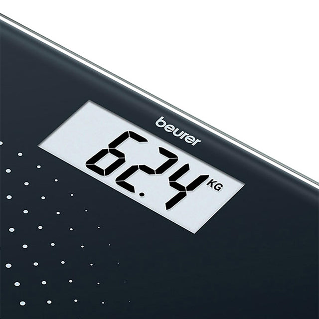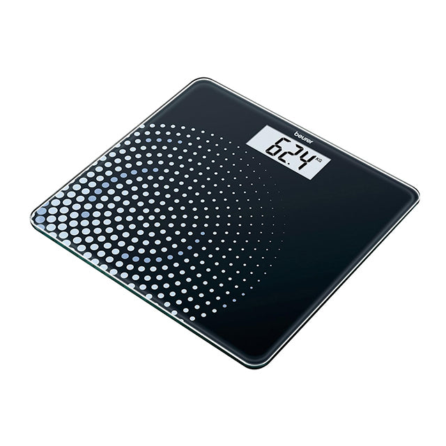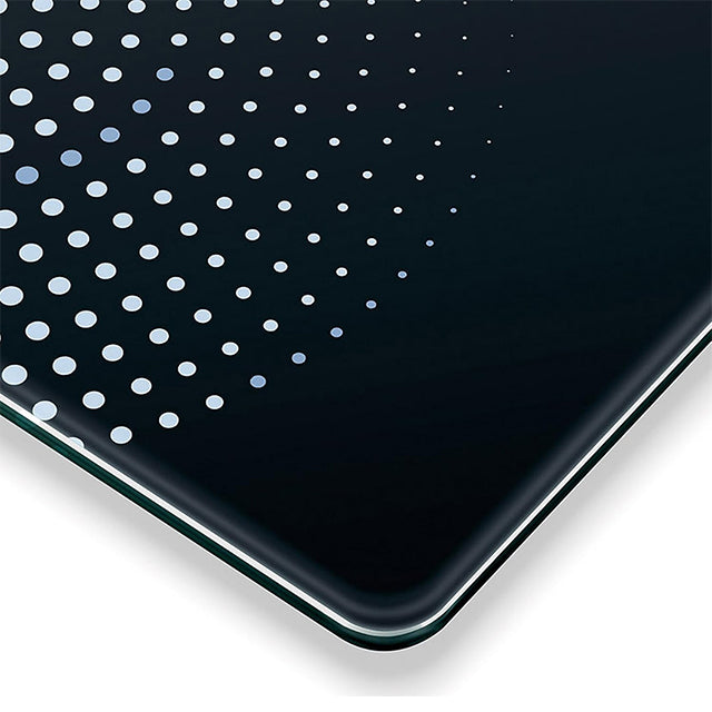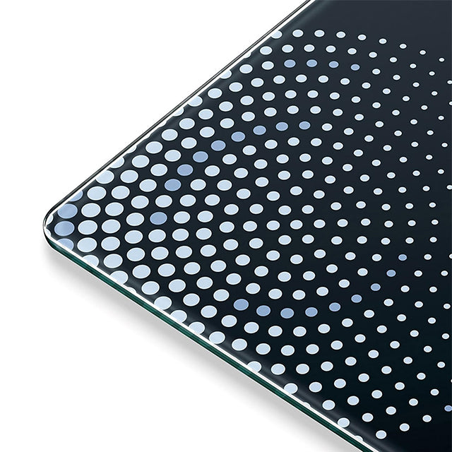 Large-format glass scale Standing surface made from extra strong 8 mm safety glass Easy to read LCD display Digit size: 36 mm Flat construction Striking printed design Change over to kg/lb/st 180 kg capacity Graduation: 100 g Overload indication Automatic switch-on and switch-off 2 x 3V CR 2032 batteries included