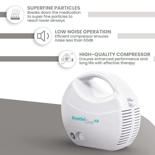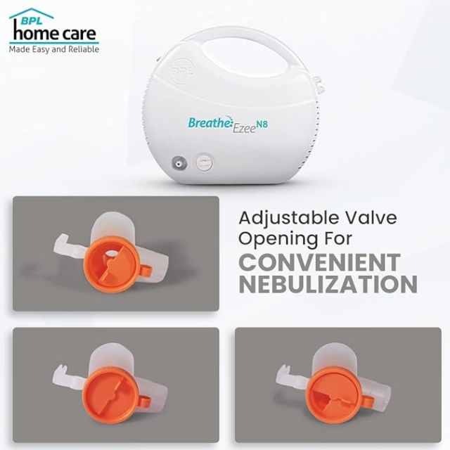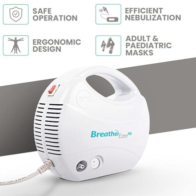 BPL Breathe Ezee N8 compressor nebulizer is equipped with superior quality motor and an inbuilt fuse that ensures enhanced performance, durability, and safe operations . It breaks down the medication to superfine particles which can reach the lowest airways ensuring effective treatment. The low noise operation, portable design and easy to use features makes it a must have device at home for respiratory treatments like asthama, chronic bronchitis, allergies and other respiratory disorders. The device comes with a 8ml medication cup, flow controller nebulization kit and both adult & paediatric masks. It ensures effective nebulization through short inhalation time and efficient medicine delivery for users of all age group.