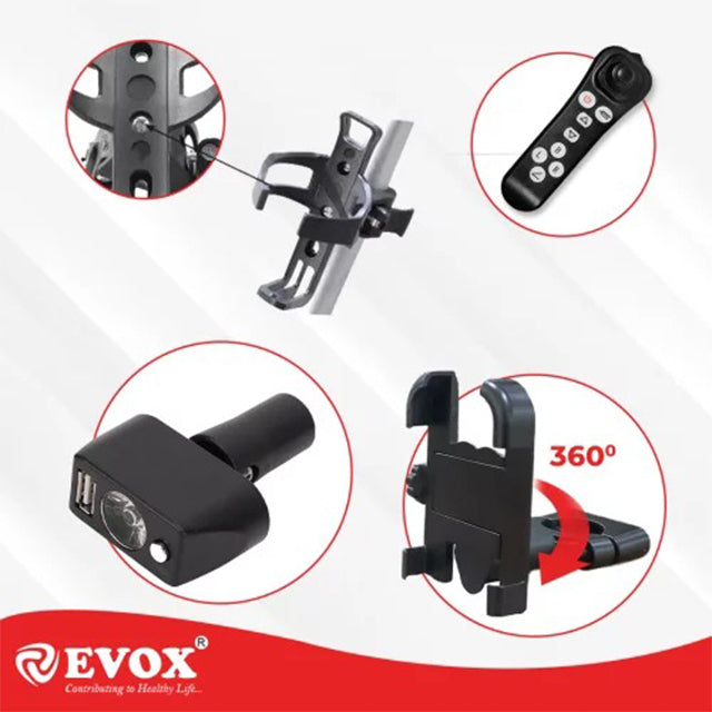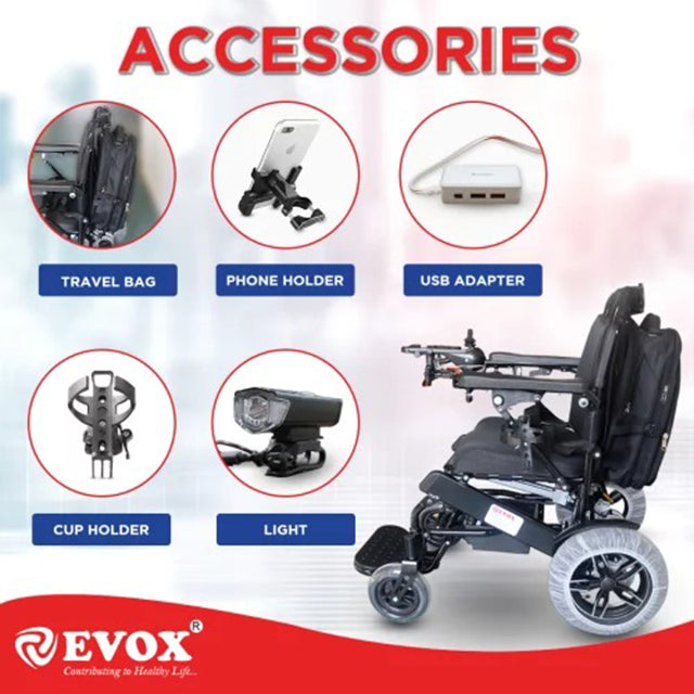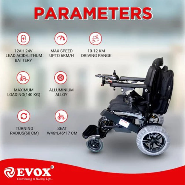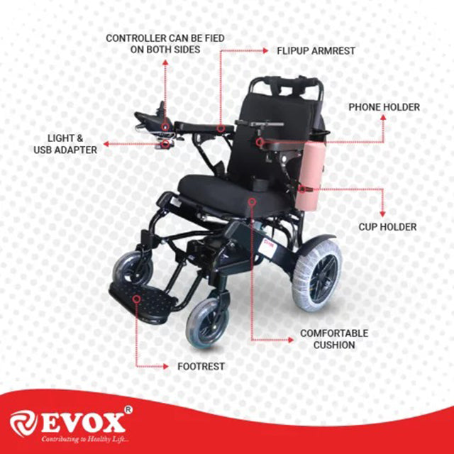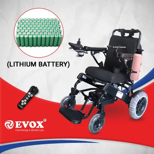 Evox offers an ergonomically folding design that allows the wheelchair to fold flat for convenient storage and travel. Our folding wheelchair for older individuals facilitates independent mobility with specialized features such as soft padded armrests, storage pockets, and rexine upholstery. This power wheelchair is suitable for both indoor and outdoor use. Users should be able to easily enter and exit the wheelchair, maneuver it efficiently, and conduct repairs as needed. A functional, comfortable, foldable power wheelchair that enables efficient propulsion can lead to increased activity levels. Enhanced independent mobility and improved physical function may reduce reliance on others. The batteries are easily removable and it includes a foldable backrest along with fire-retardant antibacterial upholstery. Designed as a contemporary, lightweight, and cost-effective solution, this power wheelchair caters to individuals with mobility issues, fatigue, neuromuscular disorders, or cardiovascular disorders.