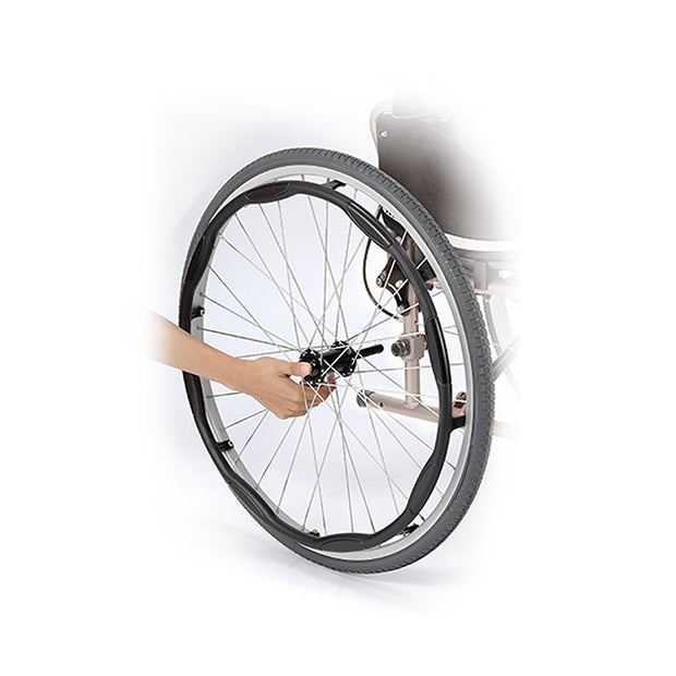 Reduce the weight and size of the wheelchair with the quick-release rear wheels. No tools required. The wheels are easy to remove for storage and transportation.