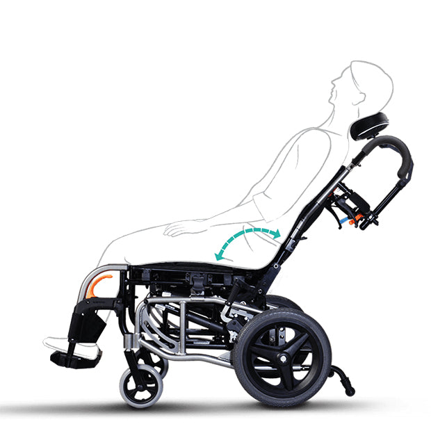 Sliding is a major concern for standard reclining chairs. Sliding creates shearing between the user’s back and back of the wheelchair and poor positioning. The VIP 2 solves this problem by relocating the reclining pivot point of the chair and bringing the user’s hip joint closer to it. This placement synchronises the motion of the body and the chair and minimizes sliding and shearing when reclining or sitting upright.