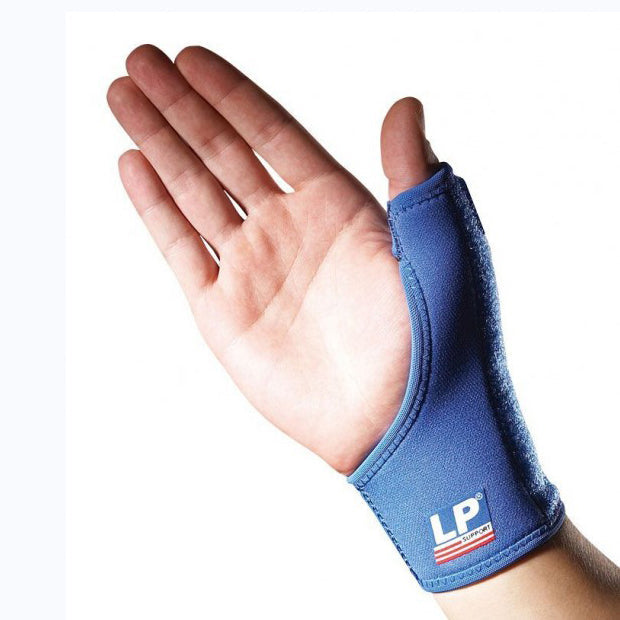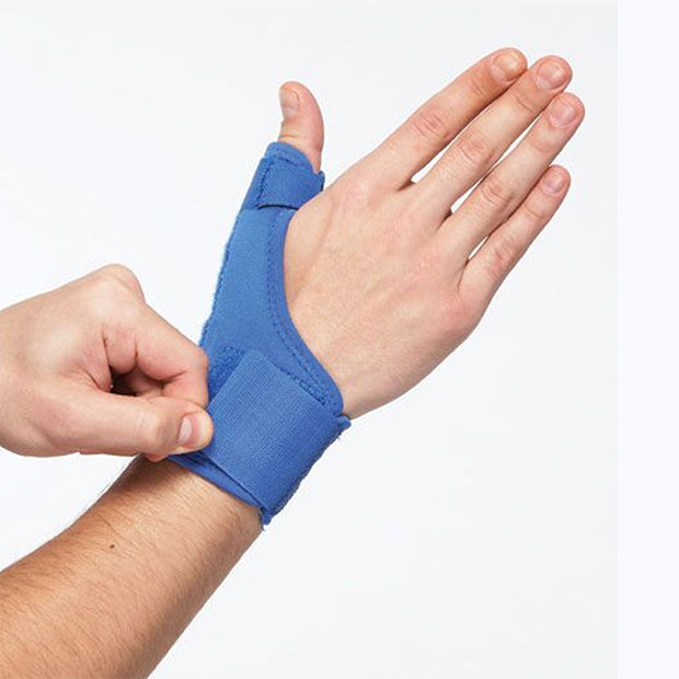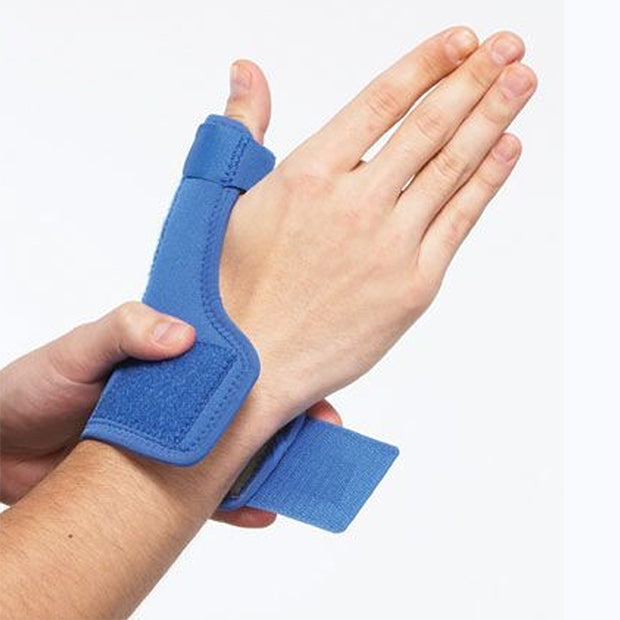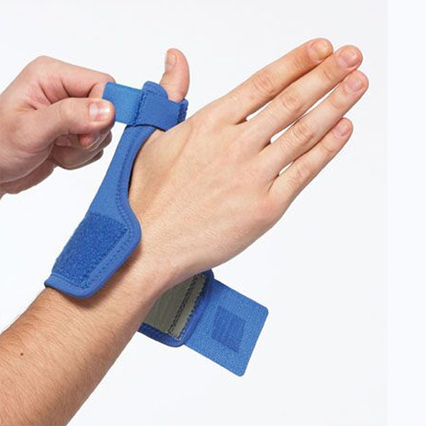 Metal stay for partial immobilization of thumb. Free mobility of the fingers. Prevents De Quervain's disease and supports weak or injured wrist.