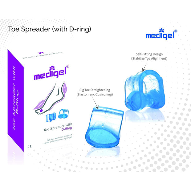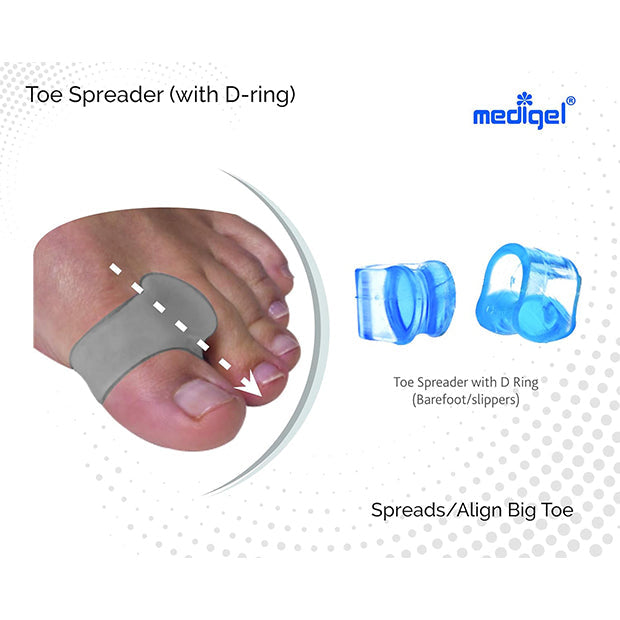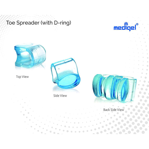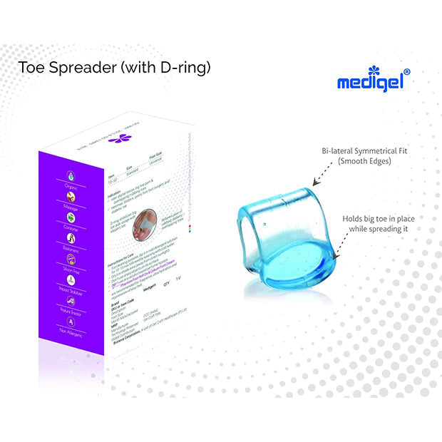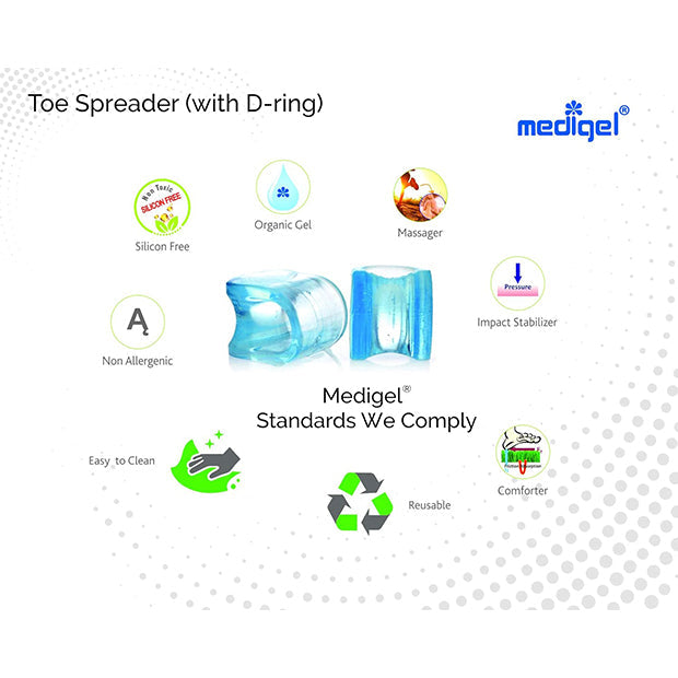Toe Spreader with D-ring is specifically designed to aid straightening of big toe, thereby preventing overlapping toes. The major cause of overlapping toes is the response of changes in hind and mid foot dynamics, injuries or body weight leads to increase in pressure on toes. Toes try to manage by overlapping each other as reaction to this continuous pressure. However, their closeness in damped shoes might cause infections, also hardening of skin, leads to corns and calluses. Any injury might lead to pressure blisters or even bursa. Even nail growth pattern gets affected, with increase in associated nail pains. The first impact initiates with loss of straightening of big toe as major toe for pressure dispersion. To prevent this build up effect, toe spreader should be used. Toe Spreader is designed for straightening of toe by spreading affect only, however if there is associated pain is building up, it is advisable to use Toe Spreader (with D-ring) as it holds big toe from both opposite faces. Toe spreader (with D-ring) is easily useful in chappals too being extra stable. All these properties are attributed towards Medigel technology. Medigel is visco-elastic gel (≥ 0.8 g/cc density & ≥ 170% oil swelling), rebounds in less than fraction of second. It’s core tensile strength is ~14 Kg/cm3 with elongation strain withstanding ability of ≥ 500 %. It’s tear strength is ~3.5kM/m with less than 4% compression set. Accordingly it is an ideal elastomeric cushion able to distribute pressure equally in all directions. It can withstand up to -25°C with no cracks and hypoallergenic (doesn’t support any fungal growth). It is latex, silicone and polyurethane free, inert/organic and reusable. Products are CE Approved with acceptance from FDA (India). Products are developed in WHO-GMP certified Indian manufacturing facility. The technology is protected and reserved by Gel Craft, Italy and exclusively available via Bionova Corporation.