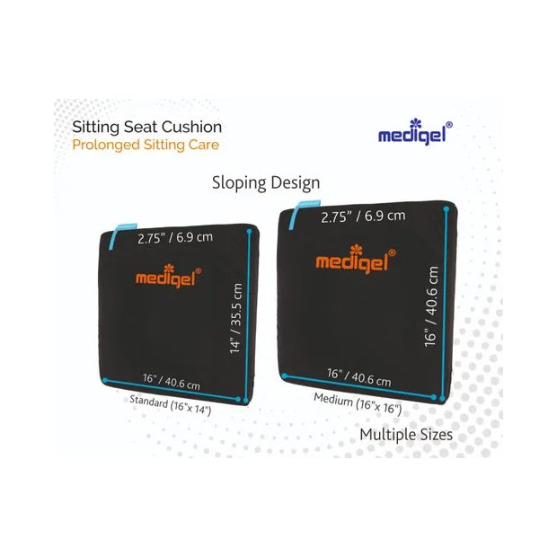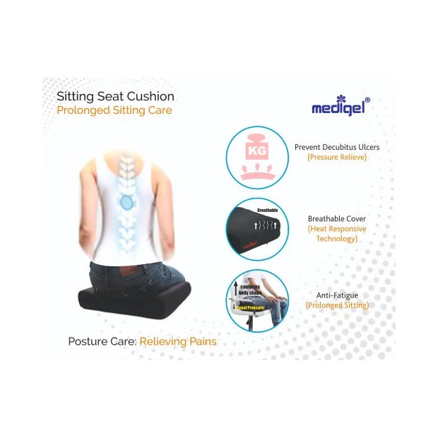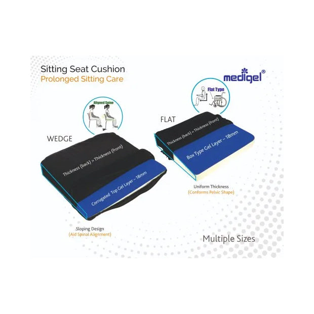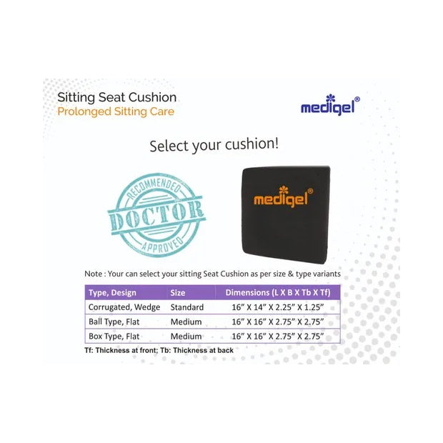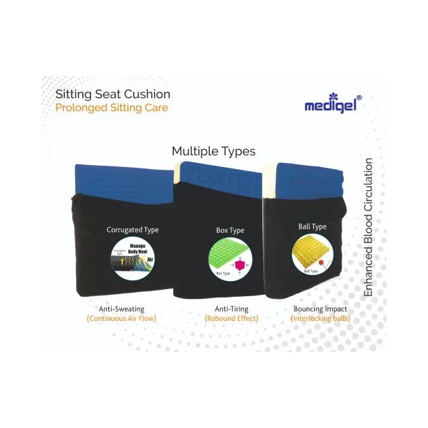 Top gel layer (18mm, corrugated, box or ball type) distribute pressure equally at buttocks, manages body heat, conforms to body shape, reducing fatigueCorrugation (anti-sweating), ball type (bouncing impact), box type (rebounding impact) enhance blood circulationWedge type (slope - 1")aid faster weight transfer to feet & spinal alignment, however if your existing seat is flat from long time, flat type is advisable Designed for all types of chairs (official & home use); dining chairs / car seats; wheel chairs
