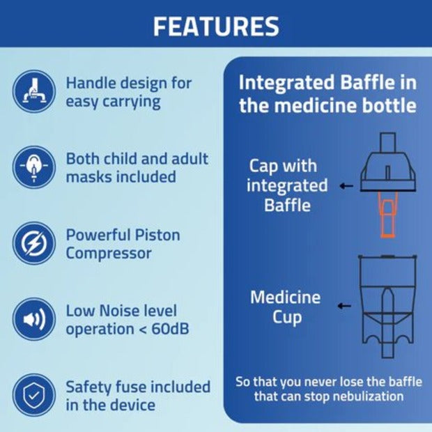 We at Medtech wanted to make nebulization hassle free and hence we innovated with the baffle in the medicine cup. While other brands offer a loose baffle which is a tiny part in the medicine cup and can get lost which completely stops the nebulization, We came up with an innovative integrated baffle design ensures that you never lose any parts of the nebulization cup, thus letting you have a hassle-free usage of the product.