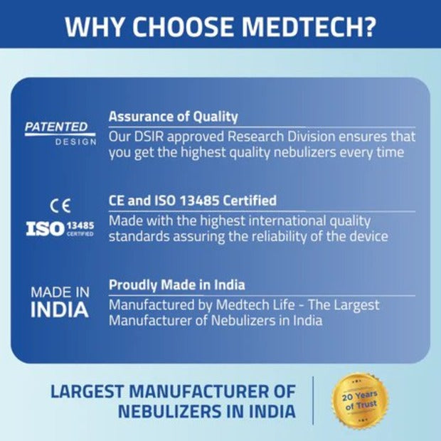 Adding to the safety, Medtech Nebulizers also have a safety fuse in the device to protect you from any current fluctuations adding to the complete safety.