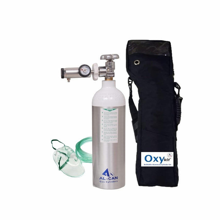Oxy Kit includes – Al-Can make Aluminium Alloy Cylinder, Bull nose wheel type Valve, Bull Nose Regulator, Bag, Mask, Oxygen Enriched Air.