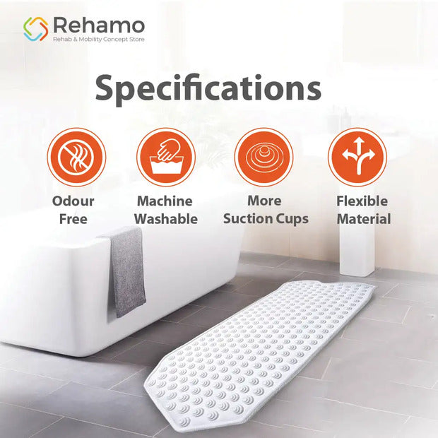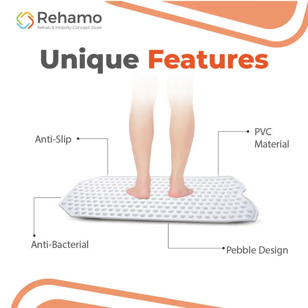 Rehamo Transparent Clear Non-Slip Bath Mat with Suction Cups prevents the risk of slipping and falling in bathrooms, which occurs on wet slippery floors and soap residues. This anti-skid bath mat can be used on most surfaces and floors, such as washrooms, walkways, passageways, stairways, marble, granite, tile, or smooth floor surfaces. It is machine/hand washable and made of superior PVC material, making daily use easier having suction cups so that once pressed into place, it sticks firmly to the floor of a shower area, bathtub, or any smooth floor surface. It is safe to use, as the bath mat is anti-bacterial, non-toxic, and resistant to mould and mildew.