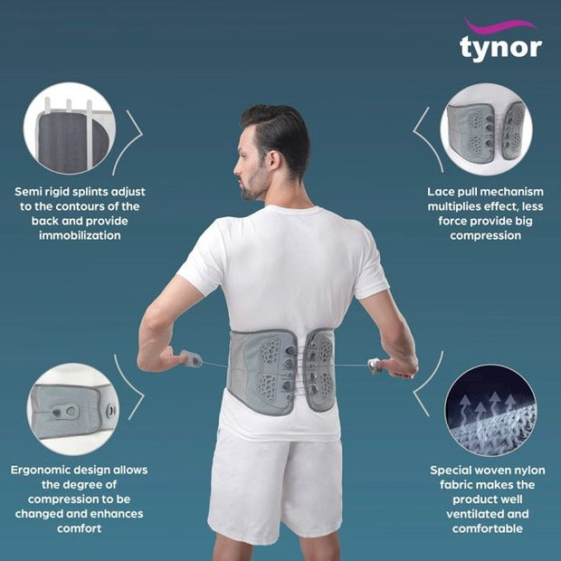 An advanced brace designed with semi-rigid back splints and multiple pulley-driven tightening mechanisms to deliver controlled and independent compression to attenuate lower back pain. It is ergonomically designed and requires little force to achieve high compression and immobilization. Recommended specifically for postoperative stabilization and multi-level decompression.