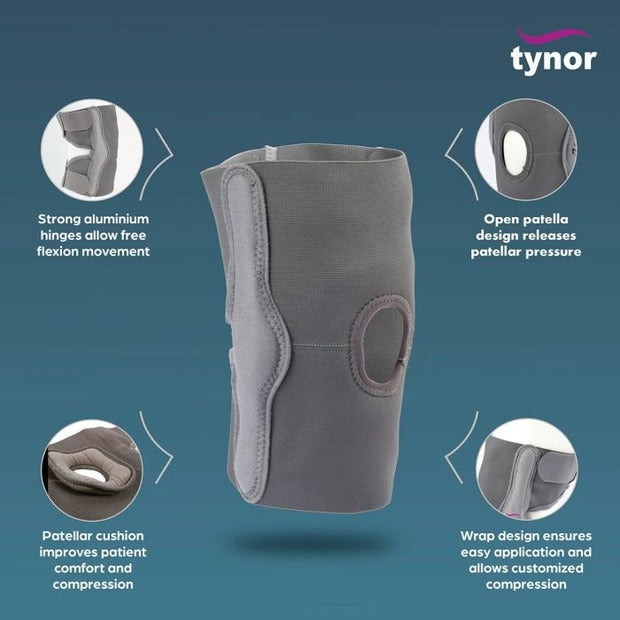 Versatile knee support which offers the advantage of knee deloading, lateral immobilization and controlled compression around the knee. It allows normal flexion and free movement of the knee joint