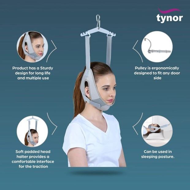 A traction kit designed to provide traction to the cervical and upper thoracic vertebrae. It eases pressure and expands the space between the neck bones by stretching the muscles and tissues. This compact kit can be comfortably used while sitting to provide relief and reduce stress on the anterior vertebral bodies.
