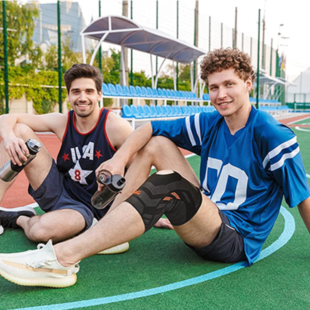 Elasticated compression sleeve to hold and compress knee muscles, to enhance the performance of players by increasing muscle density and blood circulation around the knee during sports, gyming and training. It also provides strong support and protection to ligaments and tendons thereby reduces the chances of wear and tear that can happen from workouts.