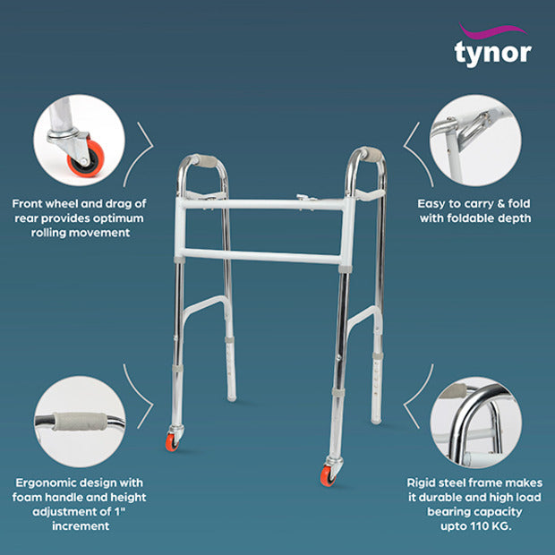 Tynor L 29 Walker Invalid's HD Silver Universal with Front Wheels pods with high-density foam hand grips give a soft and fatigue less usage. It is crafted with care to assist you in walking.