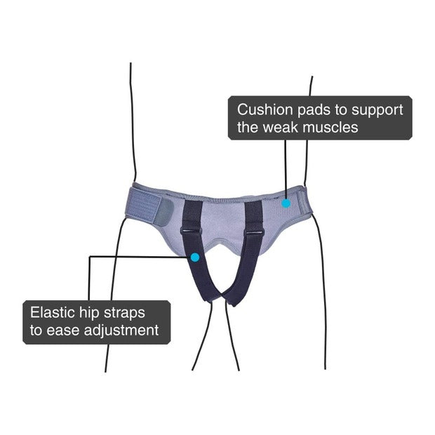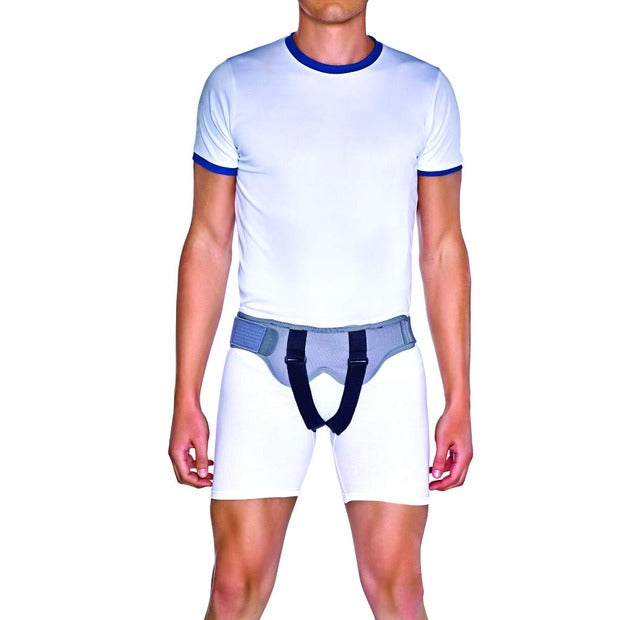 Provides support to the herniated tissue and helps in the reduction of the hernia by providing adequate pressure. Two soft anatomic foam detachable pads provide equal pressure on the hernia area. Adjustable elastic hip straps allow for adjustment and a perfect fit. Light weight support to be worn inside the pants.
