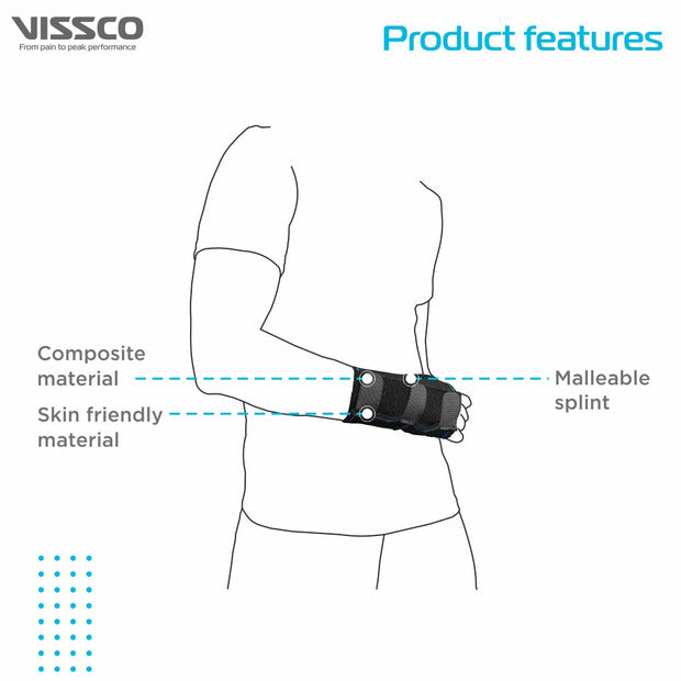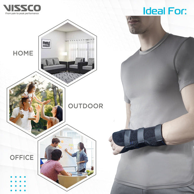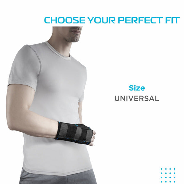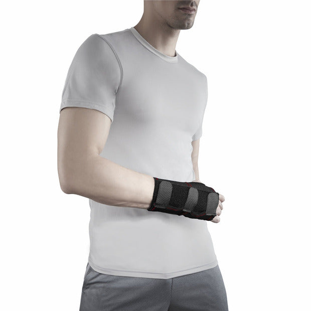 Insert your hand through the support & wrap it around the wrist with the thumb placed in opening provided. Ensure that the metal support is placed on palmar side of the wrist. Pull the straps to lock the support to a comfortable & secure fit.