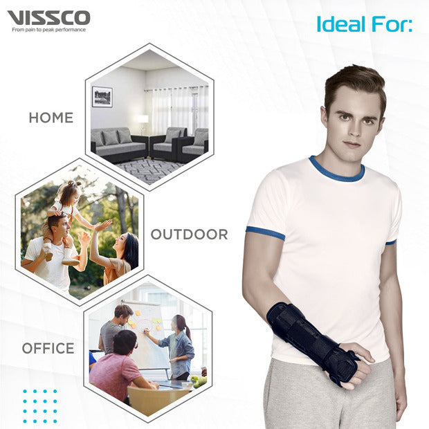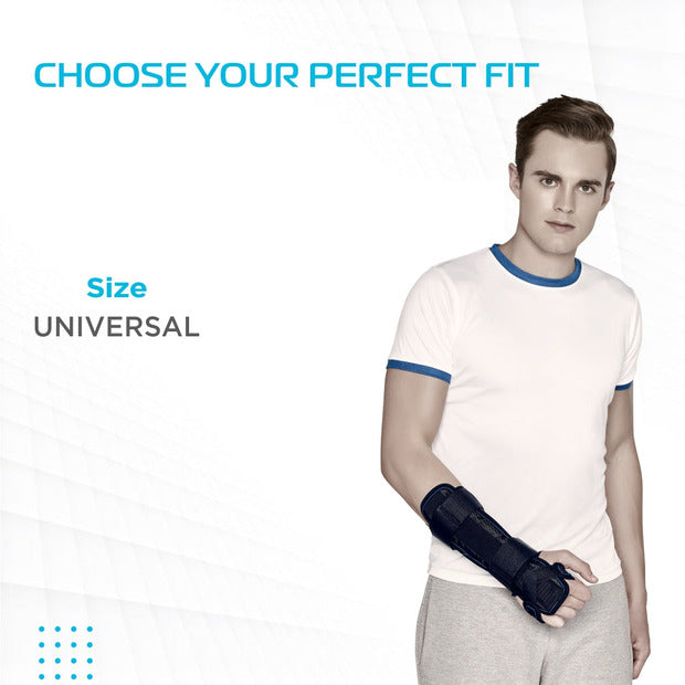 This support is scientifically designed to provide firm support to the wrist and forearm. It maintains the wrist in the cock-up/ functional position allowing free movements of the fingers and thumb. The composite material used is breathable and skin-friendly. The malleable brace on the dorsal and palmar side conform to the shape of the wrist and provide a firm support.