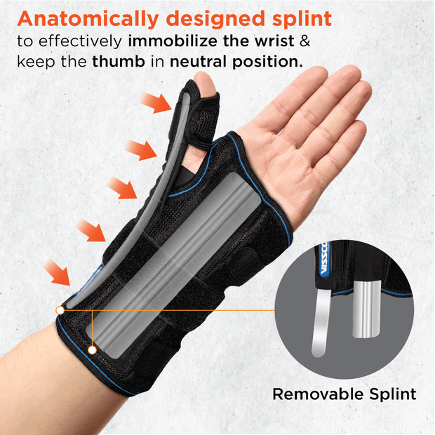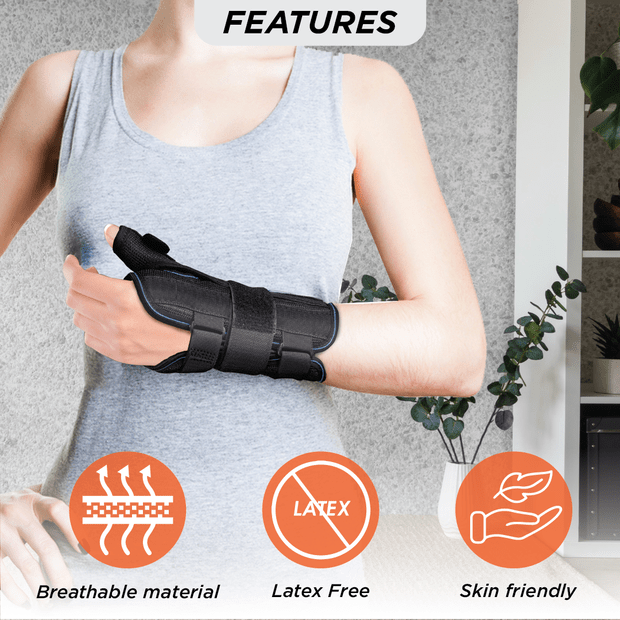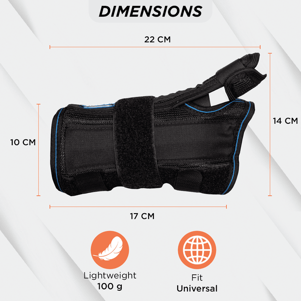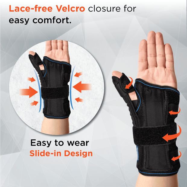 Scientific design allows for full use of your fingers while immobilizing the injured thumb and providing compression to the wrist joint for extra blood flow and enhanced recovery. Since there are no laces, the Velcro closure ensure easy application and comfort fit, making the Wrist Brace with Thumb Splint quick and easy to apply with one hand. The inner compression sleeve (slide in design) is the base of the Wrist Brace. The cock up splint on palmar side ensures perfect stabilization of injured wrist and Thumb joints.