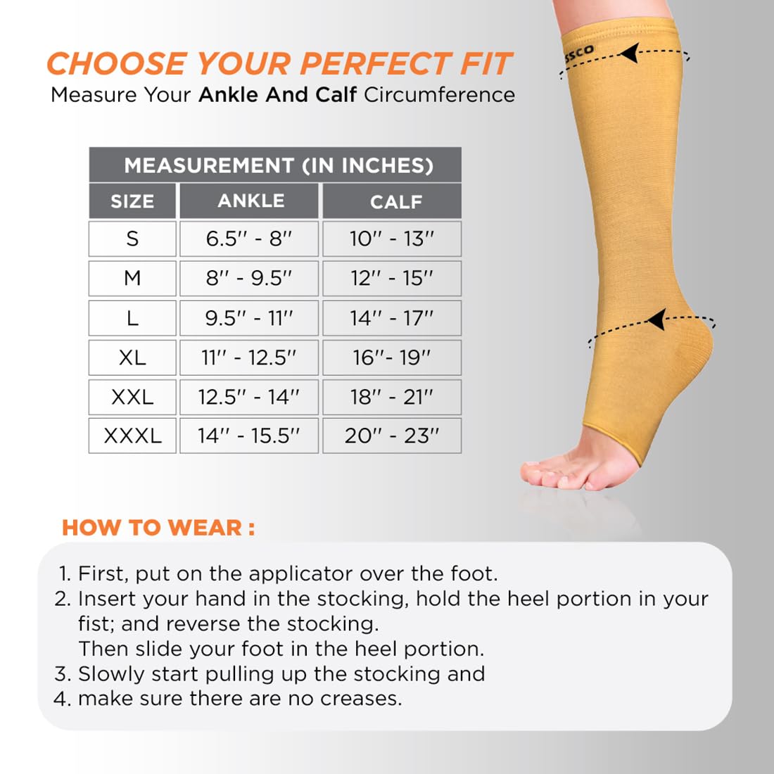This Vissco below knee compression stocking can be used for post-pregnancy leg pain, pain due to varicose veins, weak and tired legs and other conditions causing pain and discomfort in the legs and requiring mild compression support.