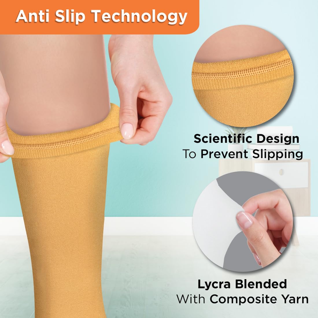 Below knee compression stockings are made of latex-free double-covered lycra blended with composite yarn to make the material durable, breathable & skin-friendly.