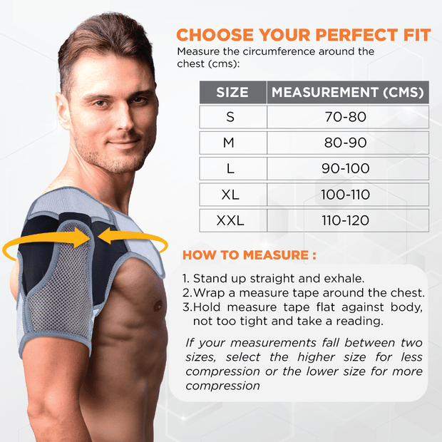 Place the support over the shoulder & lock the upper arm straps to your comfort Fix the looped elastic on one end & lock the other end around the shoulder Pull & secure the arm strap towards the shoulder to lock the humerus from slipping.