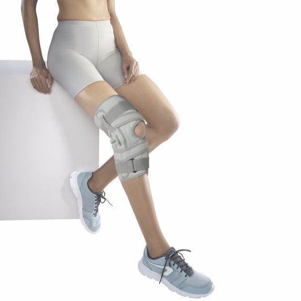 OA knee brace is made from durable, expandable patient friendly neoprene material. Aluminium multi axial sturdy hinges provide stability. Sturdy hook loop buckle straps hold the brace in place while the oblique elastic straps provide 3rd point offloading.