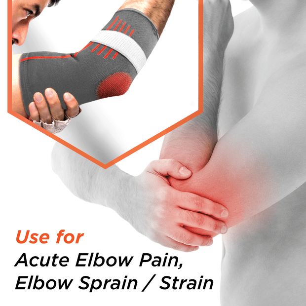 This tennis elbow support can be used for acute elbow pain, elbow sprain, elbow strain, lateral epicondylitis, medial epicondylitis and other conditions causing pain and discomfort in the elbow and requiring mild support.