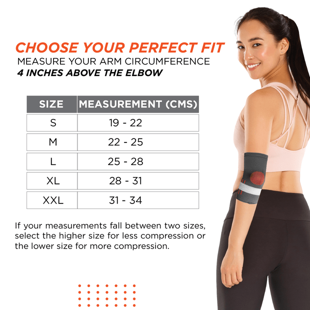 Slide arm inside & place the softer ribbed portion below the elbow. Adjust and fix the strap to a comfortable and secure fit.